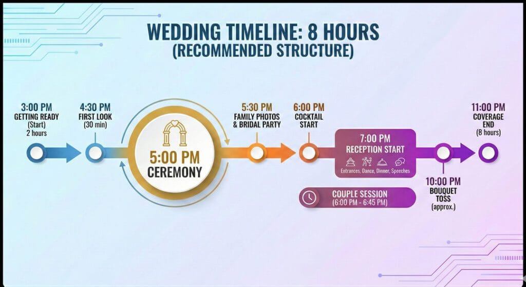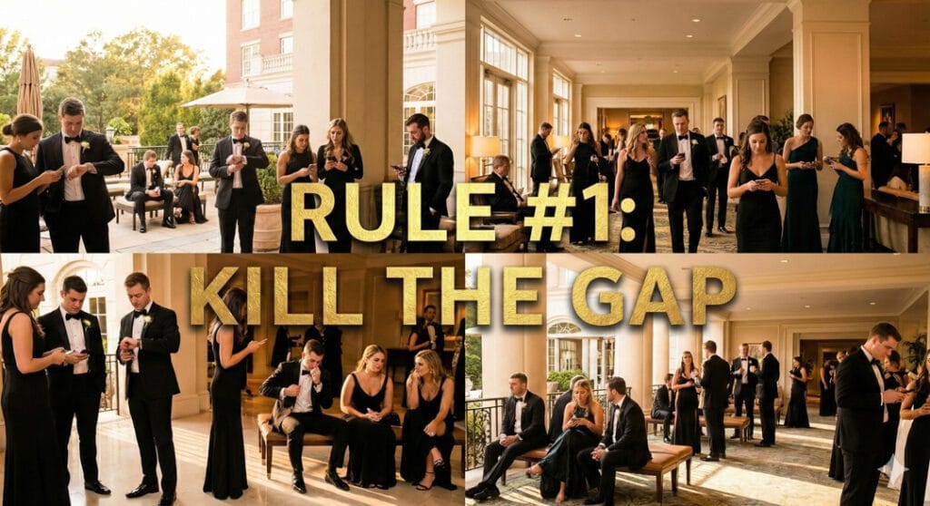 I see this mistake constantly. Ceremony at 4:00 PM… Reception at 7:00 PM. What happens in between? Your guests get bored, they get tired, and the energy of your wedding dies before the party even starts.